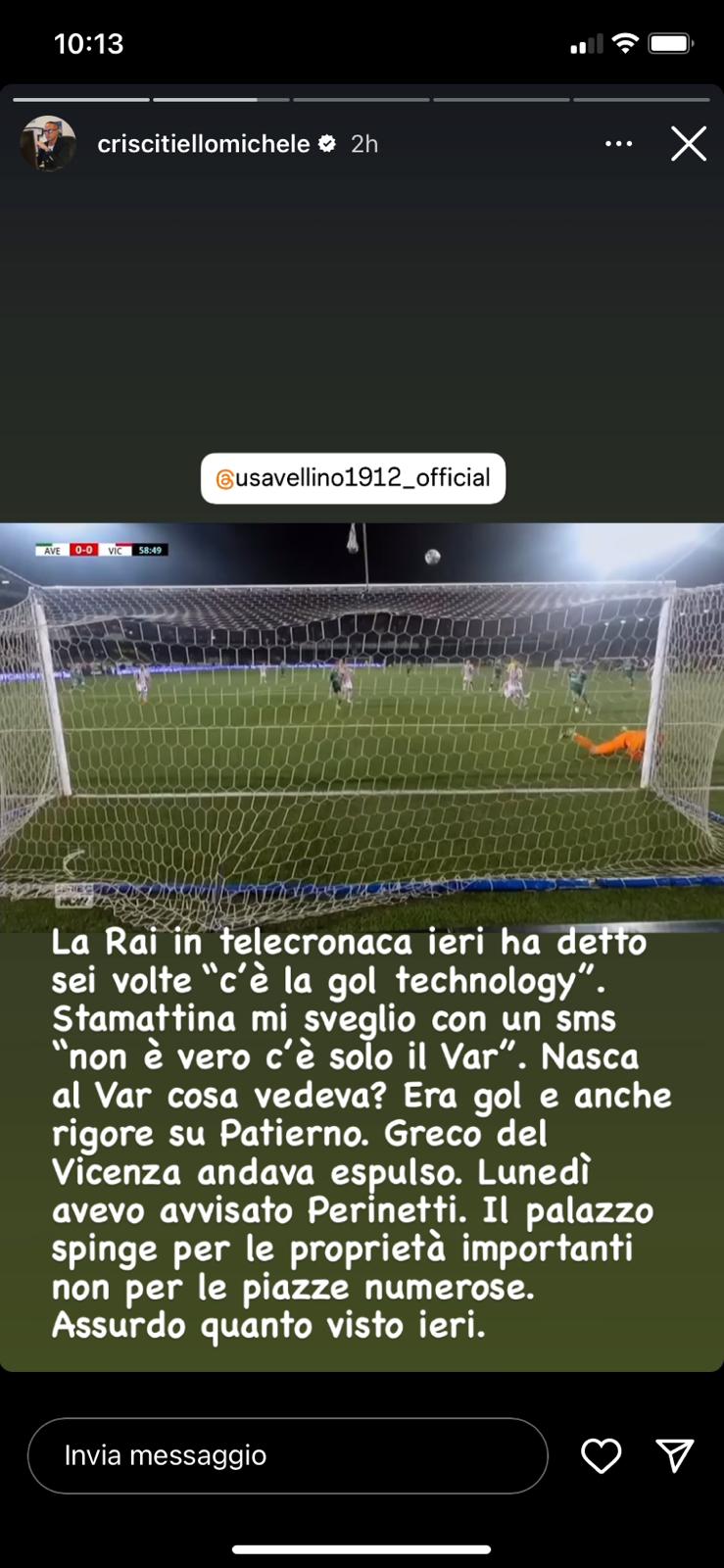Michele Criscitiello, direttore di Sportitalia, su Instagram all'indomani del match tra Avellino e Vicenza, è intervenuto così in merito agli episodi dubbi del match: "La Rai in telecronaca ieri ha detto sei volte "c'è la gol technology". Stamattina mi sveglio con un sms 'non è vero c'è solo il Var". Nasca al Var cosa vedeva? Era gol e anche rigore su Patierno. Greco del Vicenza andava espulso. Lunedì avevo avvisato Permetti. II palazzo spinge per le proprietà importanti non per le piazze numerose. Assurdo quanto visto ieri."