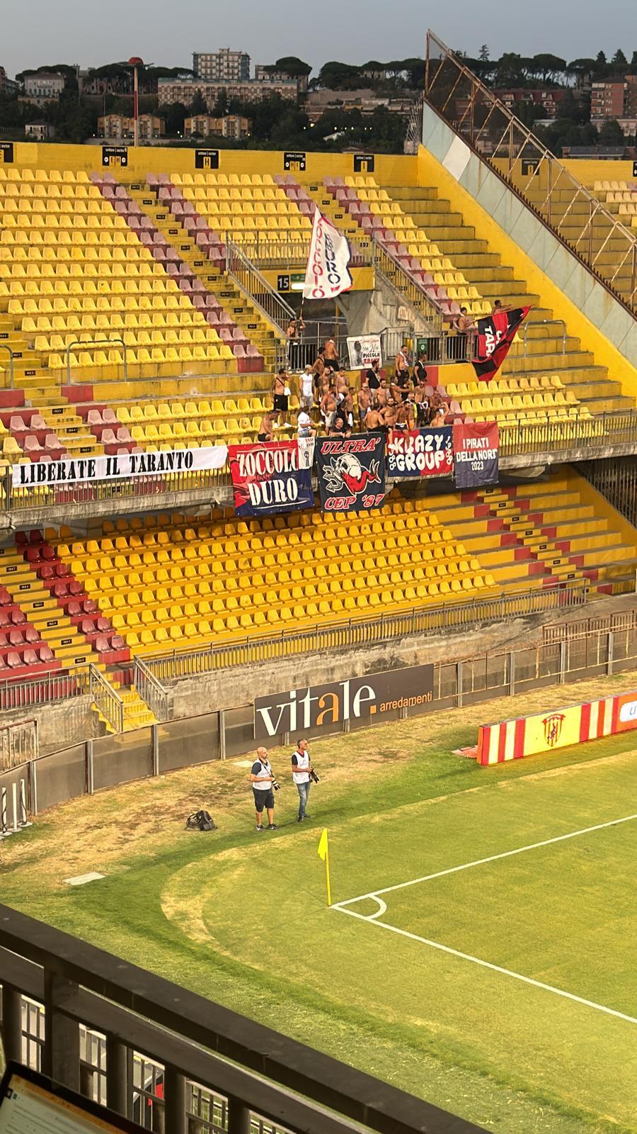 Nonostante la difficile situazione del club, un gruppo di circa venti tifosi del Taranto si sono comunque presentati a Benevento al seguito dei rossoblu. Aspra la contestazione all'uscente presidente Giove e anche uno striscione dato alle fiamme. Intanto sanniti avanti di tre reti dopo appena venti minuti contro una formazione ionica fortemente rimaneggiata.