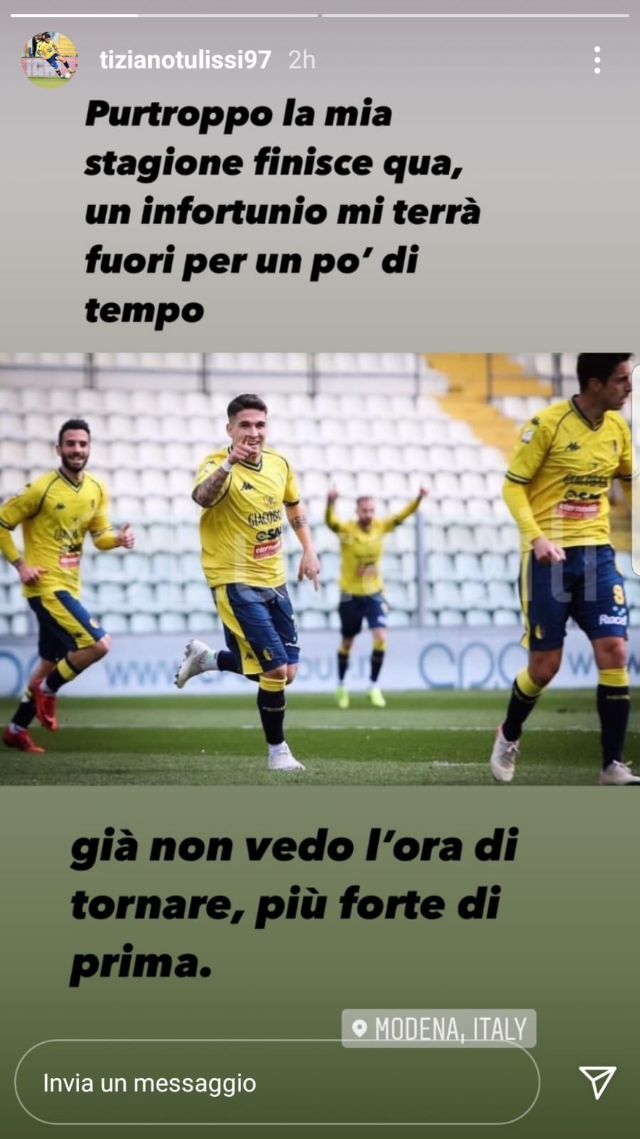 Brutte notizie in casa Modena. Non solo la sconfitta in extremis contro la Fermana ma anche lo stop per Tiziano Tulissi. L'attaccante dei canarini non potrà dare una mano ai suoi da qui alla fine del campionato, come ha spiegato la stessa punta su Instagram: "Purtroppo la mia stagione finisce qua, un infortunio mi terrà fuori per un po' di tempo. Già non vedo l'ora di tornare, più forte di prima".