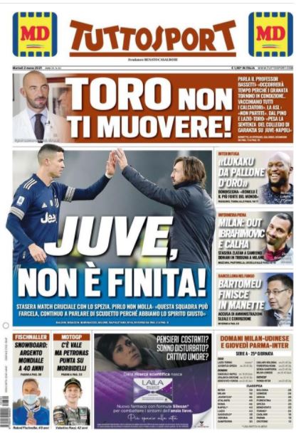 Ecco le prime pagine de La Gazzetta dello Sport, Tuttosport e Corriere dello Sport, i tre maggiori quotidiani sportivi di oggi, martedì 2 marzo 2021.
