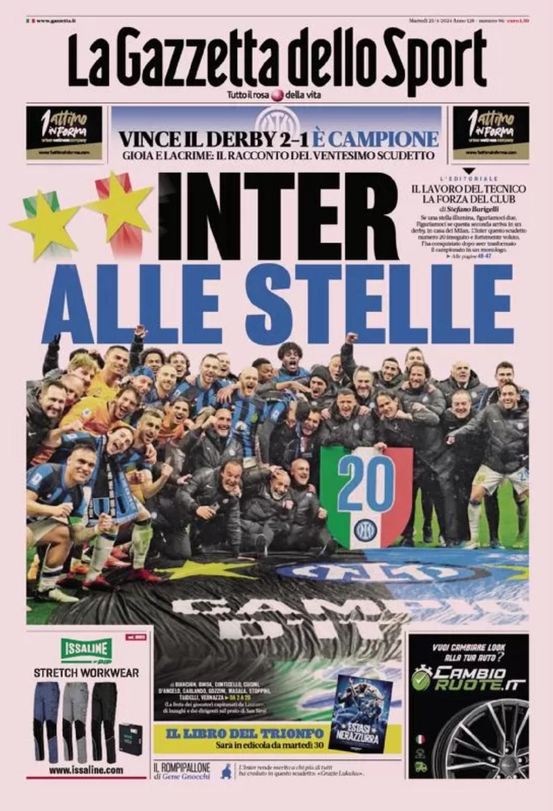 Ecco le prime pagine de La Gazzetta dello Sport, Tuttosport e Corriere dello Sport, i tre maggiori quotidiani sportivi di oggi, martedì 23 aprile 2024.