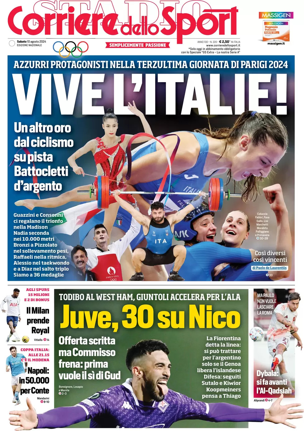 Ecco le prime pagine de La Gazzetta dello Sport, Tuttosport e Corriere dello Sport, i tre maggiori quotidiani sportivi di oggi, sabato 10 agosto 2024.