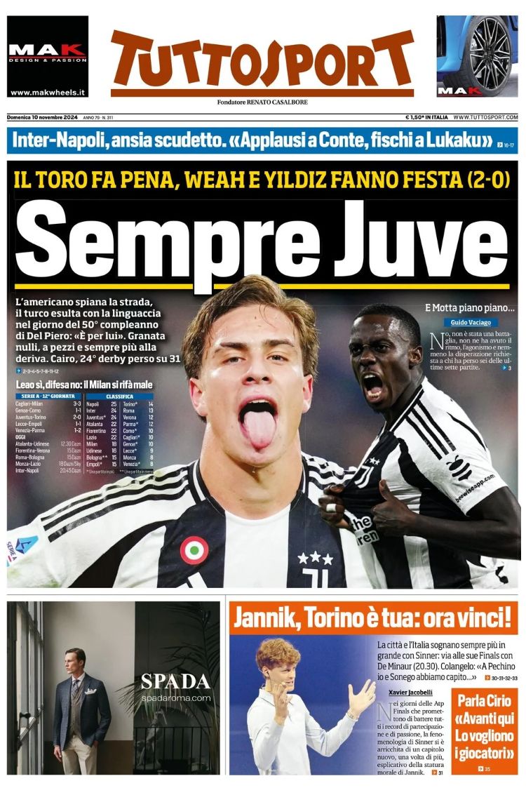 Ecco le prime pagine de La Gazzetta dello Sport, Tuttosport e Corriere dello Sport, i tre maggiori quotidiani sportivi di oggi, domenica 10 novembre 2024.