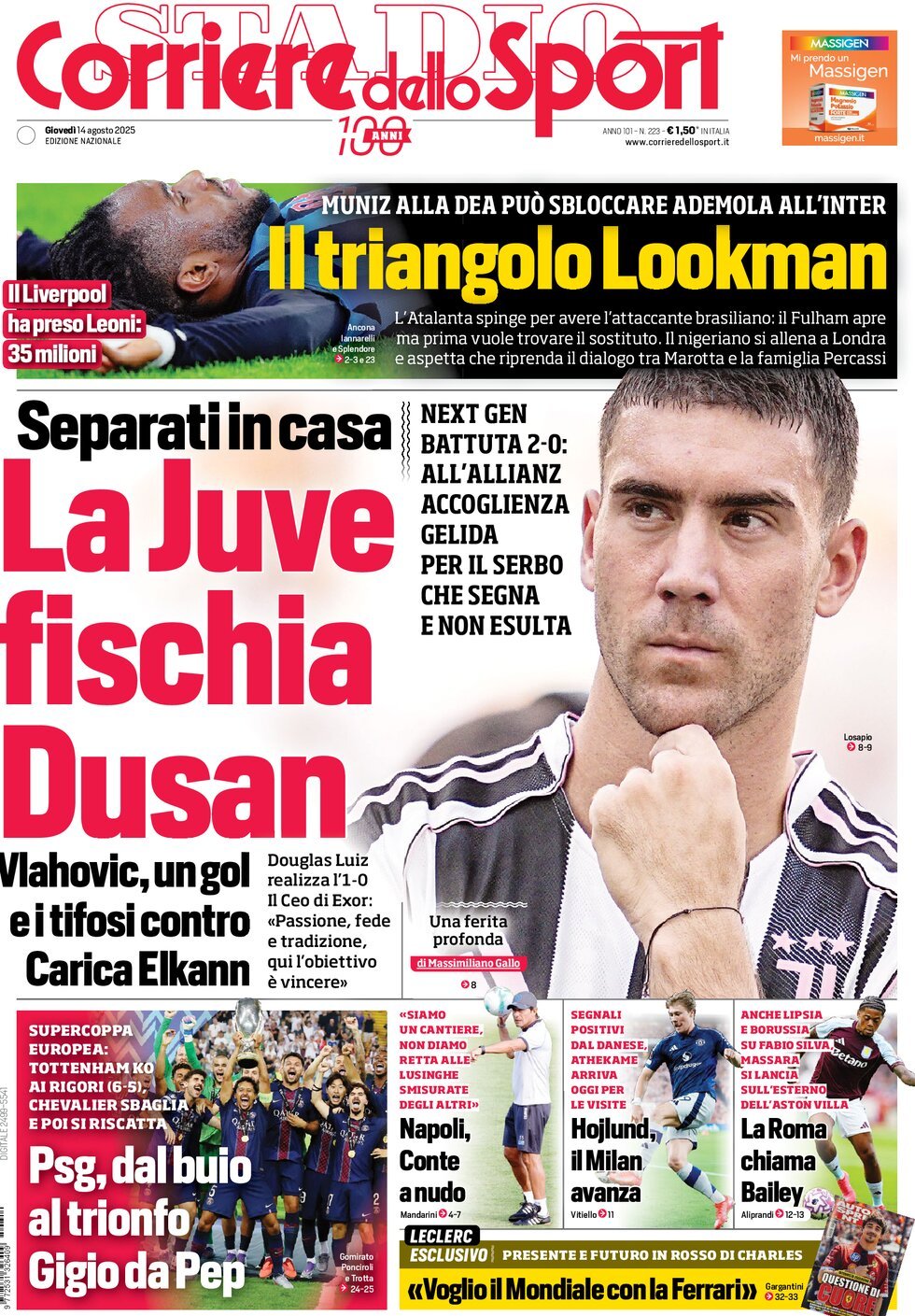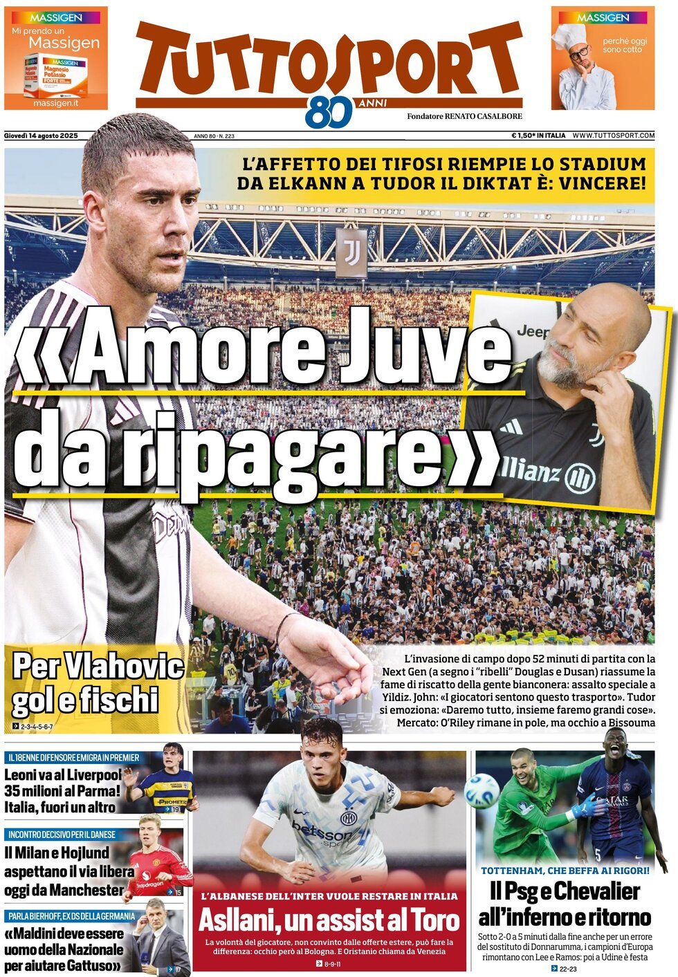 Ecco le prime pagine de La Gazzetta dello Sport, Tuttosport e Corriere dello Sport, i tre maggiori quotidiani sportivi di oggi, giovedì 14 agosto 2025.