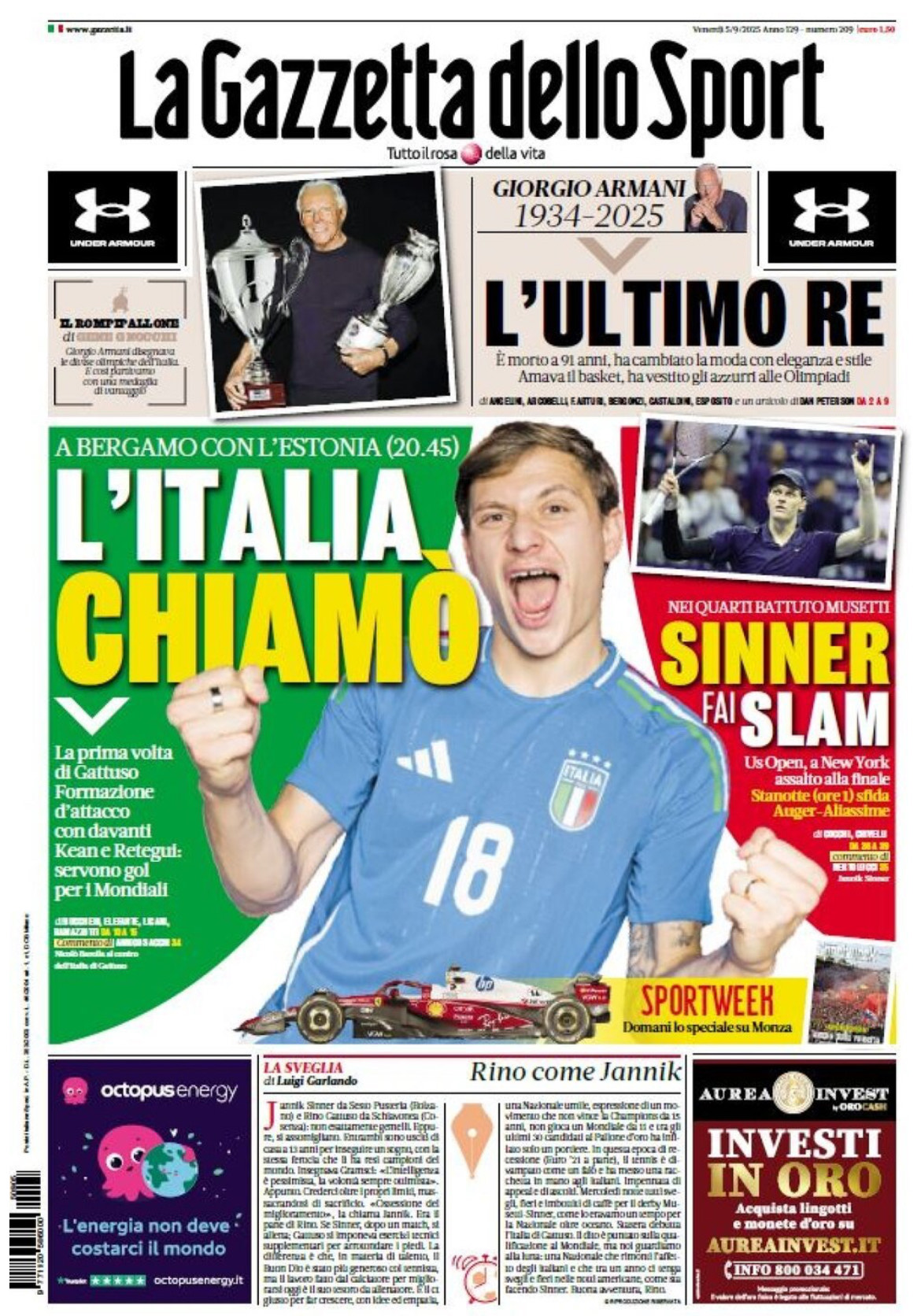 Ecco le prime pagine de La Gazzetta dello Sport, Tuttosport e Corriere dello Sport, i tre maggiori quotidiani sportivi di oggi, venerdì 5 settembre 2025.