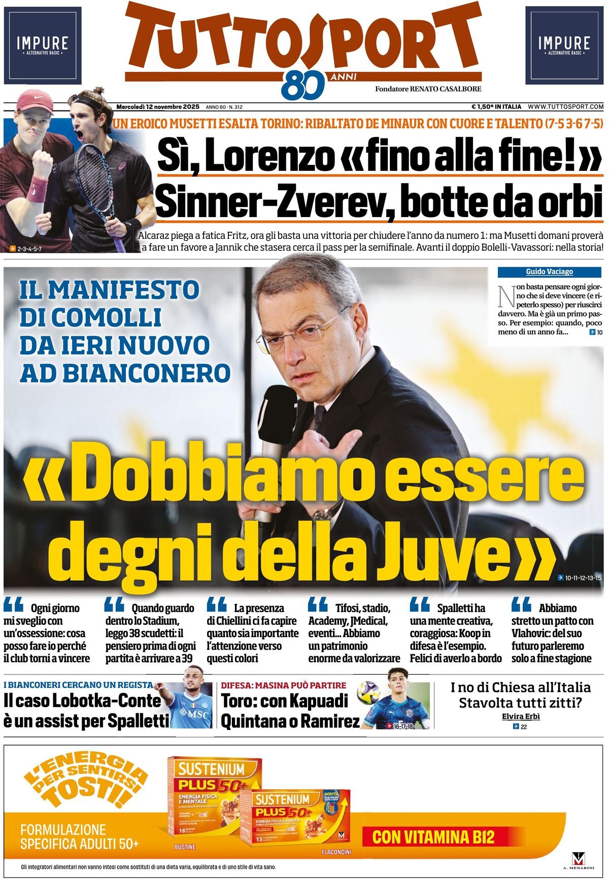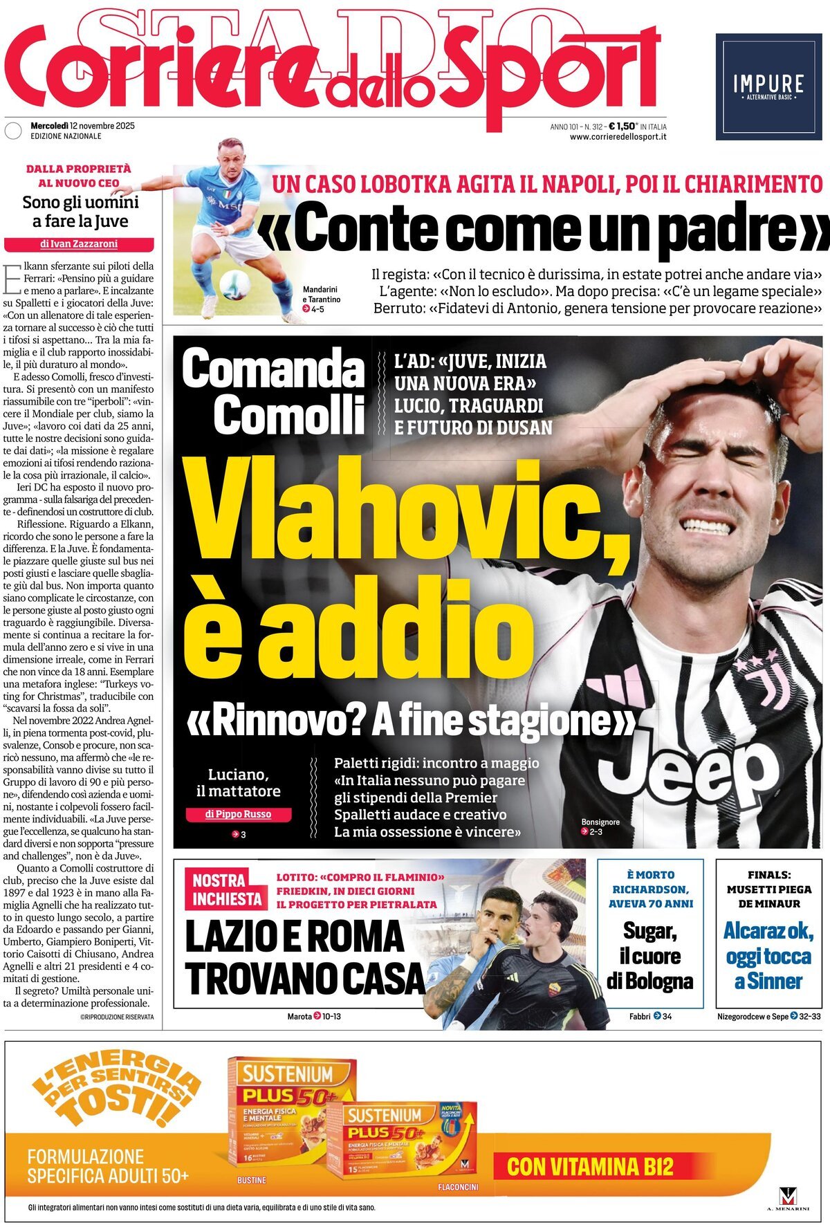 Ecco le prime pagine de La Gazzetta dello Sport, Tuttosport e Corriere dello Sport, i tre maggiori quotidiani sportivi di oggi, mercoledì 12 novembre 2025.