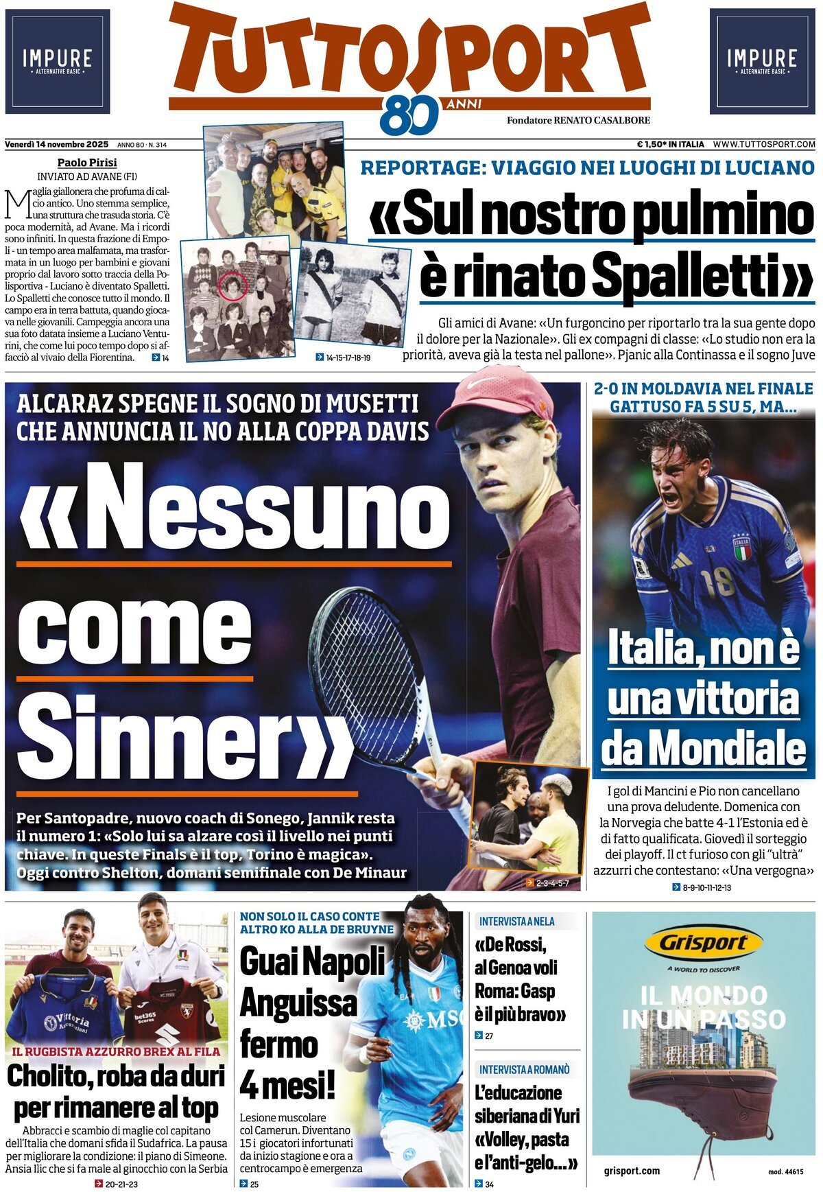 Ecco le prime pagine de La Gazzetta dello Sport, Tuttosport e Corriere dello Sport, i tre maggiori quotidiani sportivi di oggi, venerdì 14 novembre 2025.
