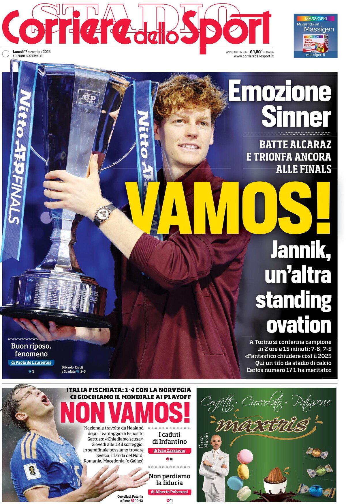 Ecco le prime pagine de La Gazzetta dello Sport, Tuttosport e Corriere dello Sport, i tre maggiori quotidiani sportivi di oggi, lunedì 17 novembre 2025.