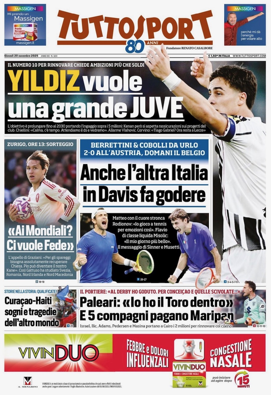 Ecco le prime pagine de La Gazzetta dello Sport, Tuttosport e Corriere dello Sport, i tre maggiori quotidiani sportivi di oggi, giovedì 20 novembre 2025.