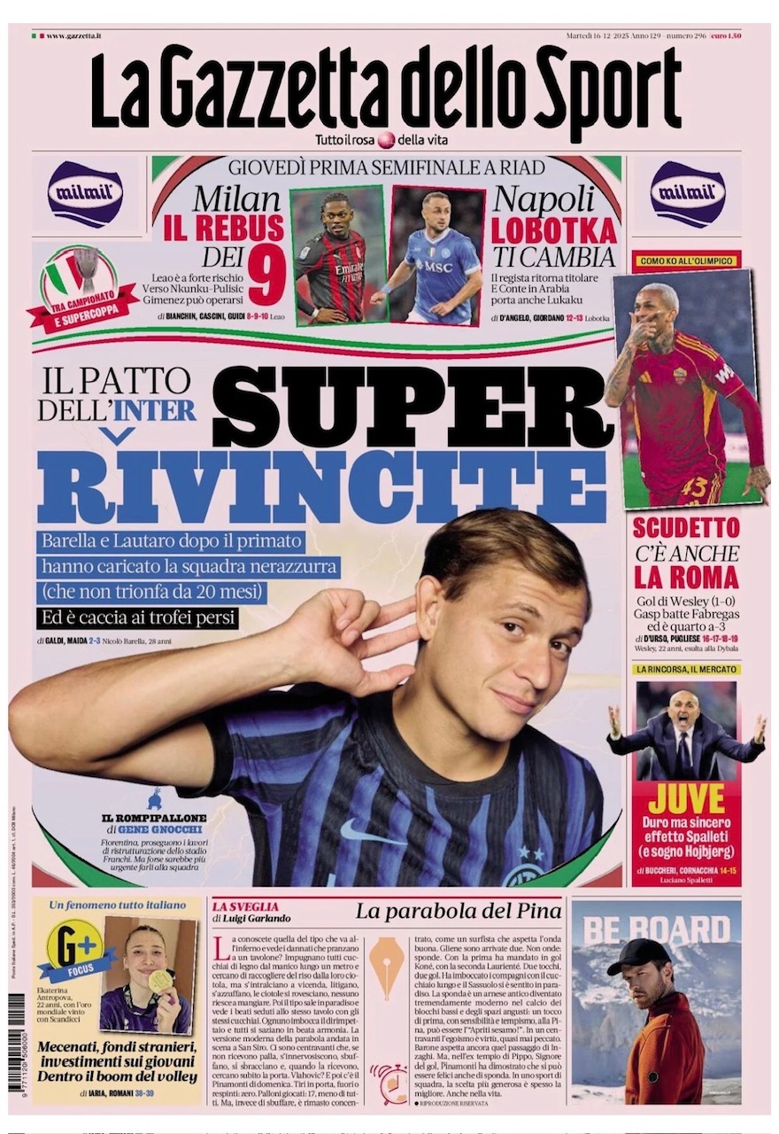 Ecco le prime pagine de La Gazzetta dello Sport, Tuttosport e Corriere dello Sport, i tre maggiori quotidiani sportivi di oggi, martedì 16 dicembre 2025.