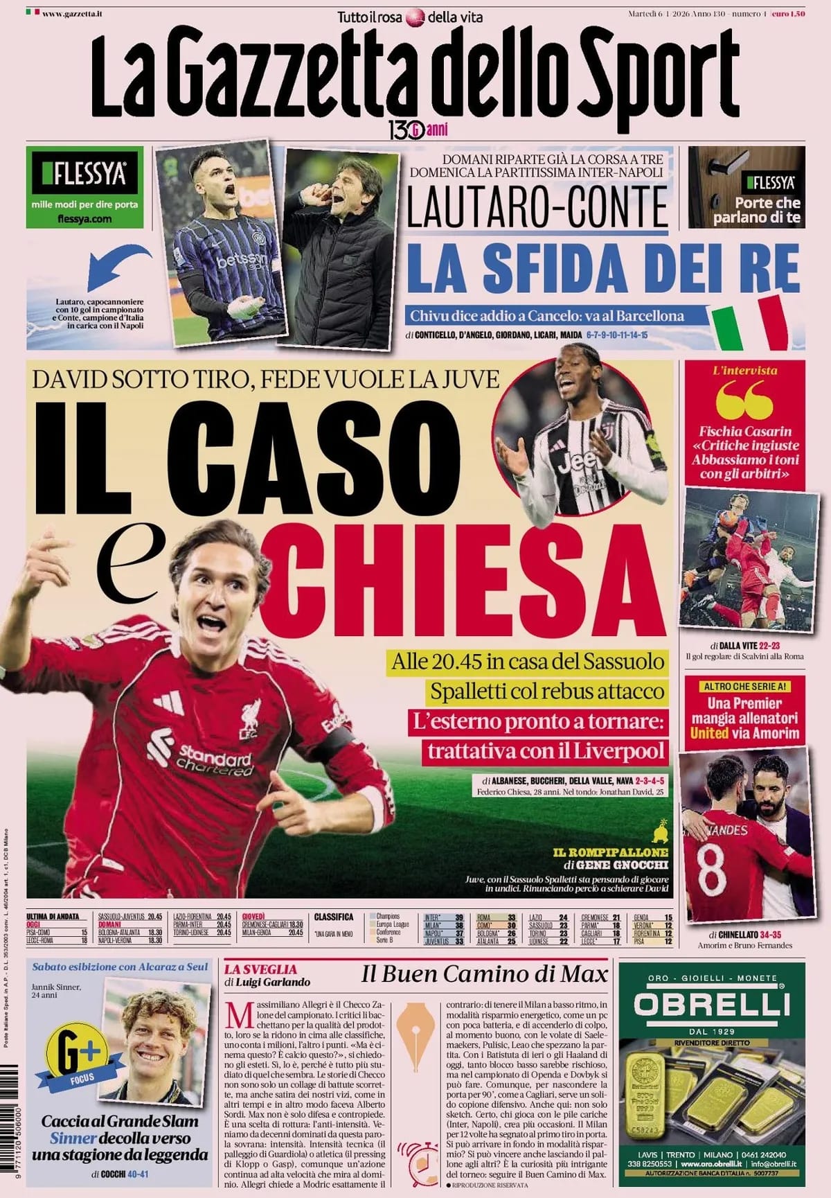 Ecco le prime pagine de La Gazzetta dello Sport, Tuttosport e Corriere dello Sport, i tre maggiori quotidiani sportivi di oggi, martedì 6 gennaio 2026.