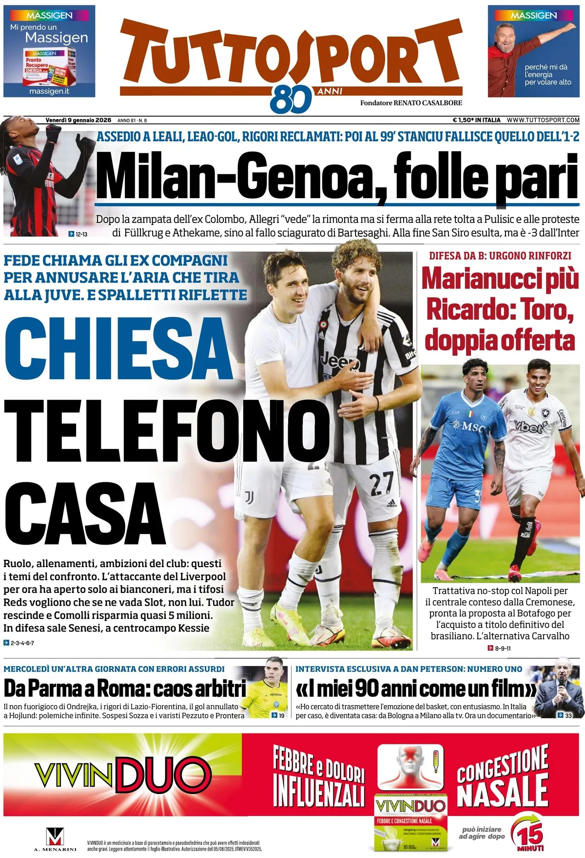 Ecco le prime pagine de La Gazzetta dello Sport, Tuttosport e Corriere dello Sport, i tre maggiori quotidiani sportivi di oggi, venerdì 9 gennaio 2026.