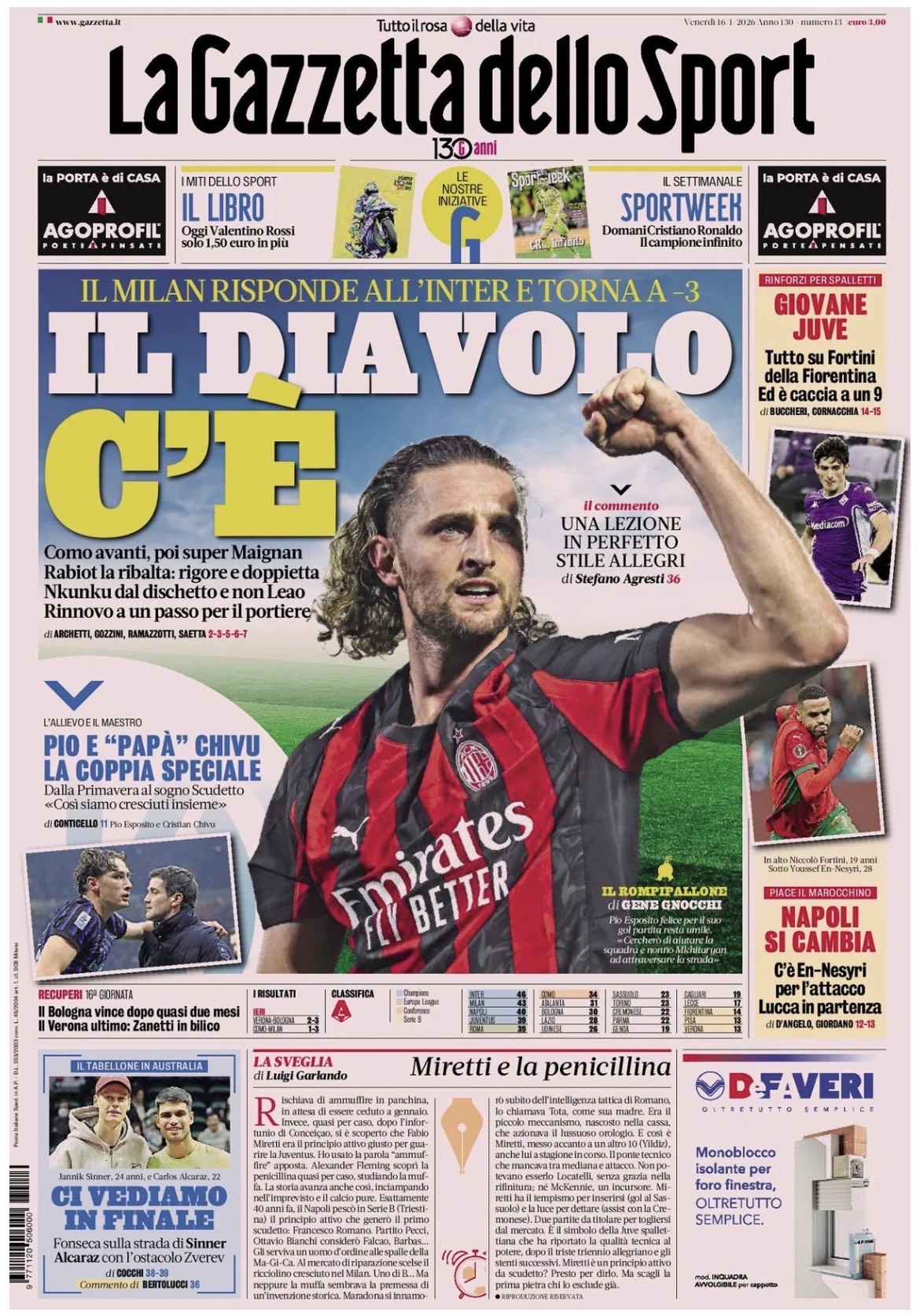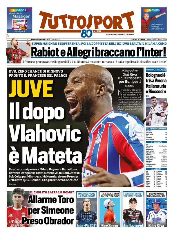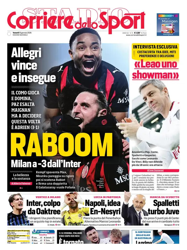Ecco le prime pagine de La Gazzetta dello Sport, Tuttosport e Corriere dello Sport, i tre maggiori quotidiani sportivi di oggi, venerdì 16 gennaio 2026.