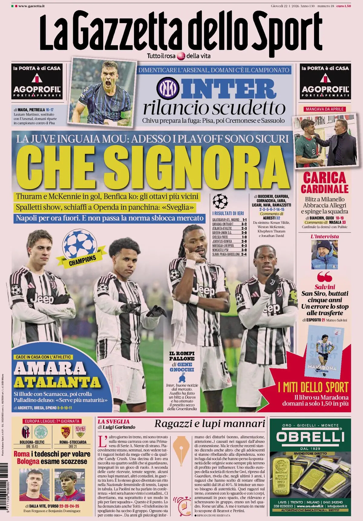 Ecco le prime pagine de La Gazzetta dello Sport, Tuttosport e Corriere dello Sport, i tre maggiori quotidiani sportivi di oggi, giovedì 22 gennaio 2026.