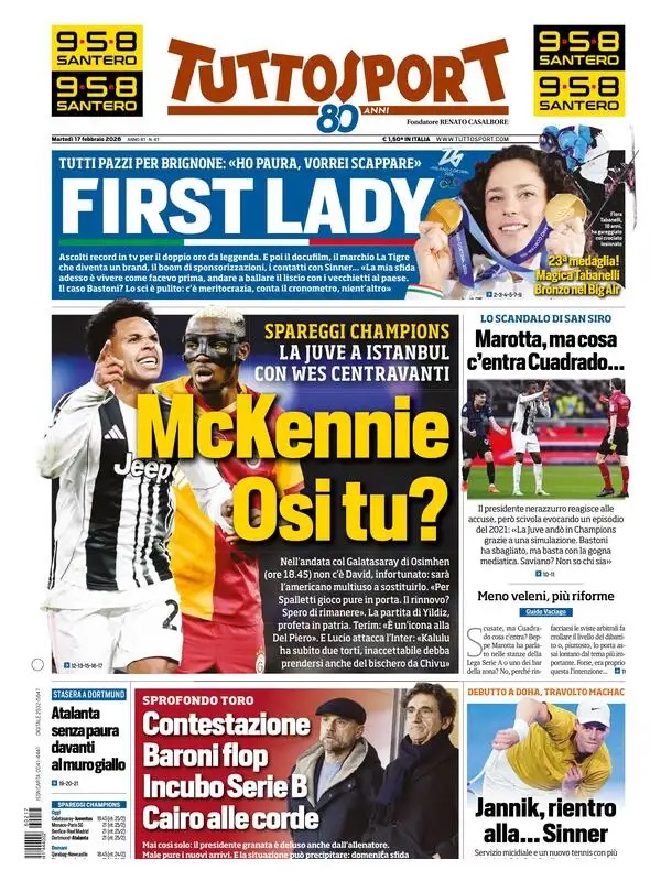 Ecco le prime pagine de La Gazzetta dello Sport, Tuttosport e Corriere dello Sport, i tre maggiori quotidiani sportivi di oggi, martedì 17 febbraio 2026.