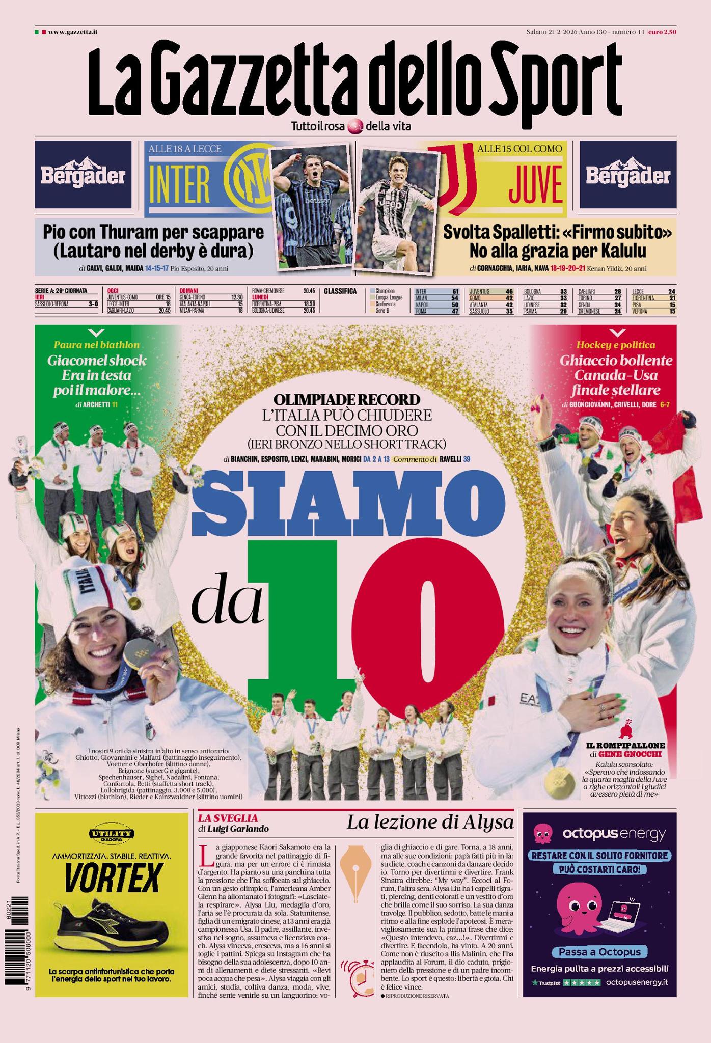 Ecco le prime pagine de La Gazzetta dello Sport, Tuttosport e Corriere dello Sport, i tre maggiori quotidiani sportivi di oggi, sabato 21 febbraio 2026.