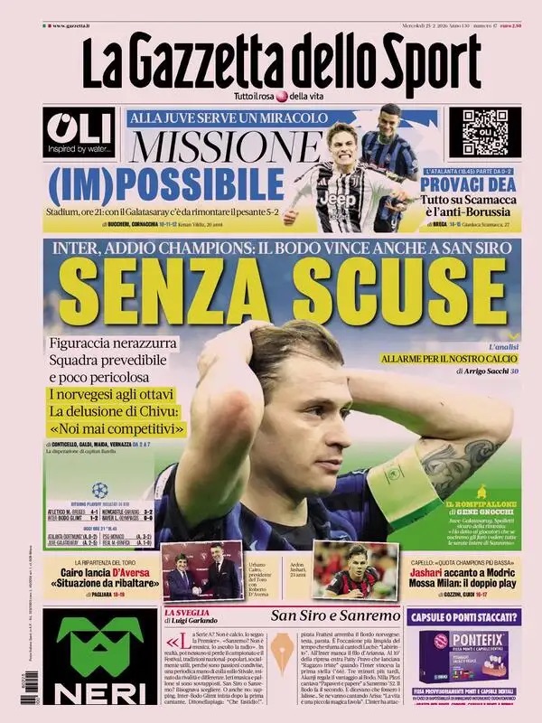 Ecco le prime pagine de La Gazzetta dello Sport, Tuttosport e Corriere dello Sport, i tre maggiori quotidiani sportivi di oggi, mercoledì 25 febbraio 2026.
