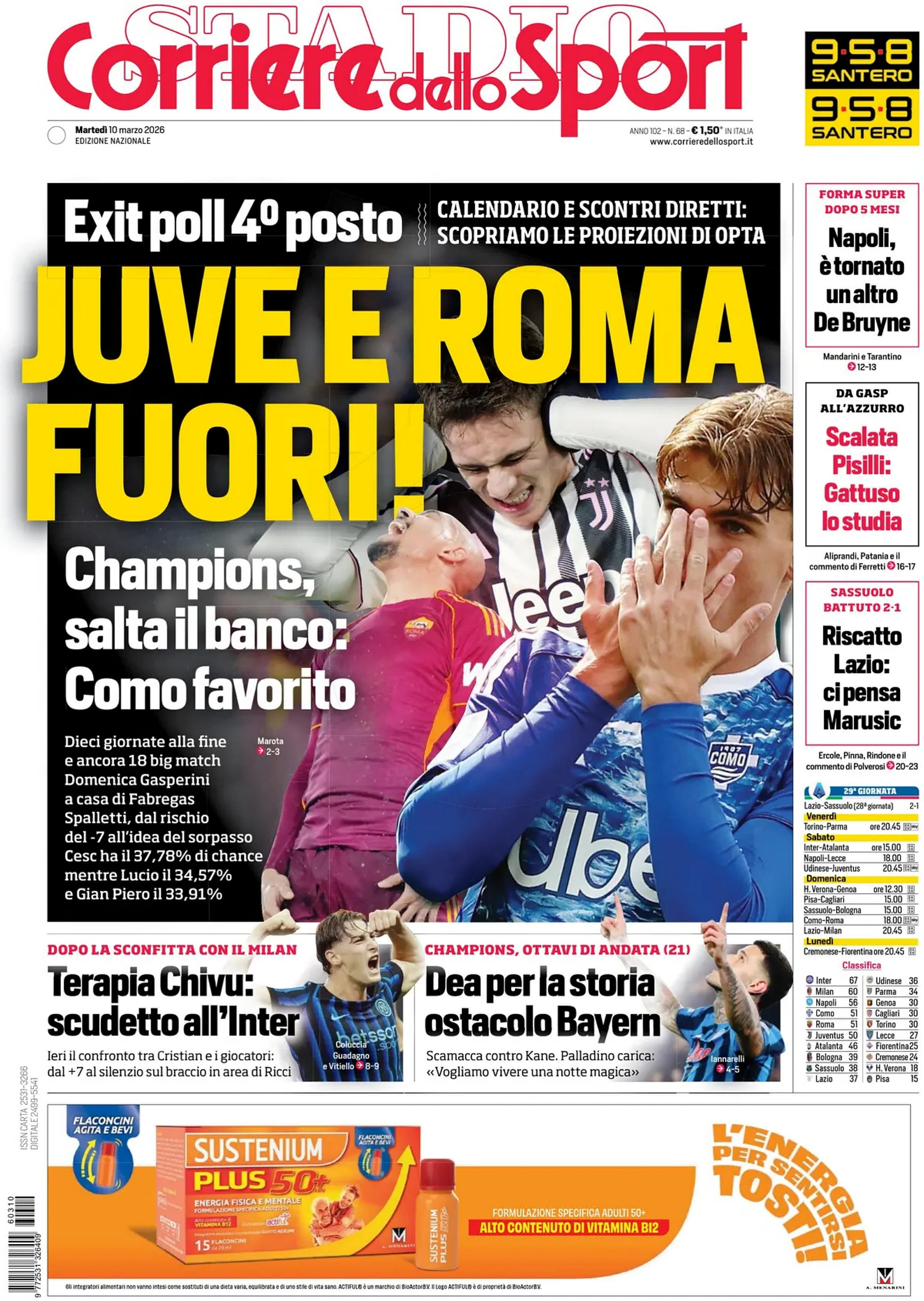 Ecco le prime pagine de La Gazzetta dello Sport, Tuttosport e Corriere dello Sport, i tre maggiori quotidiani sportivi di oggi, martedì 10 marzo 2026.