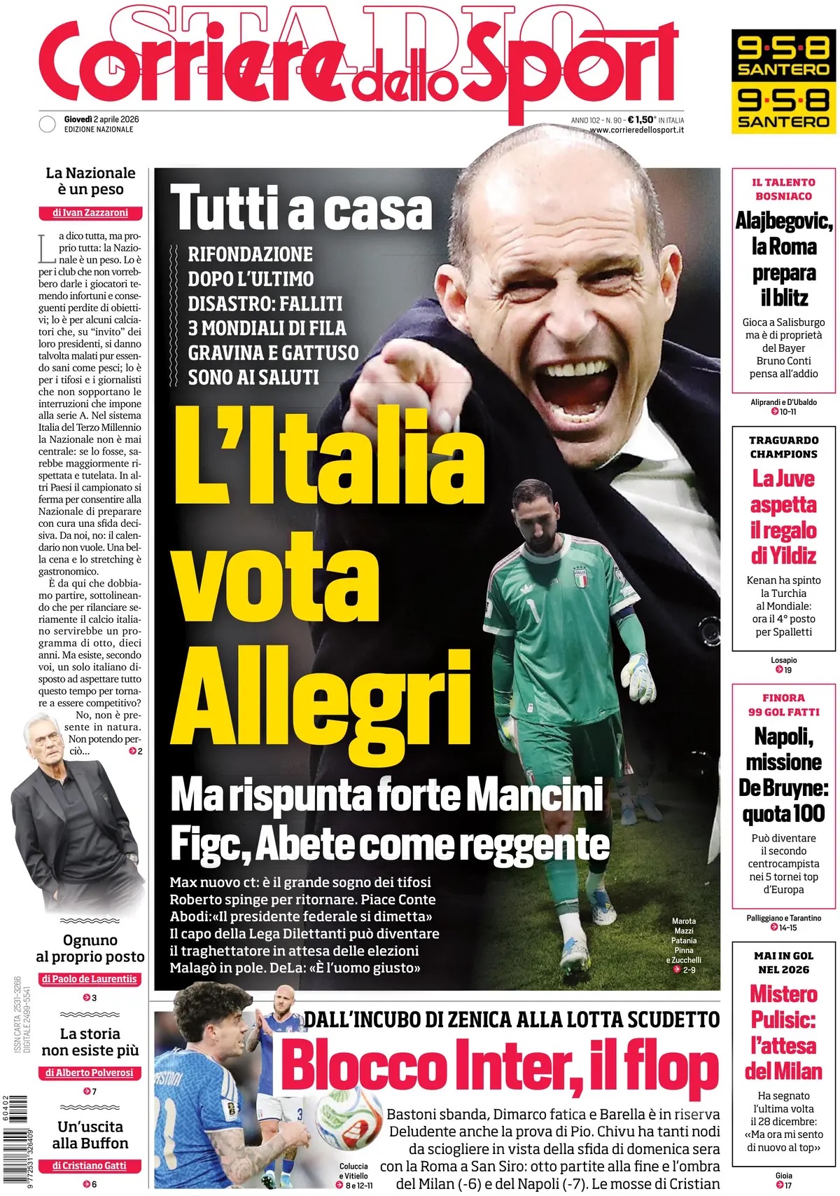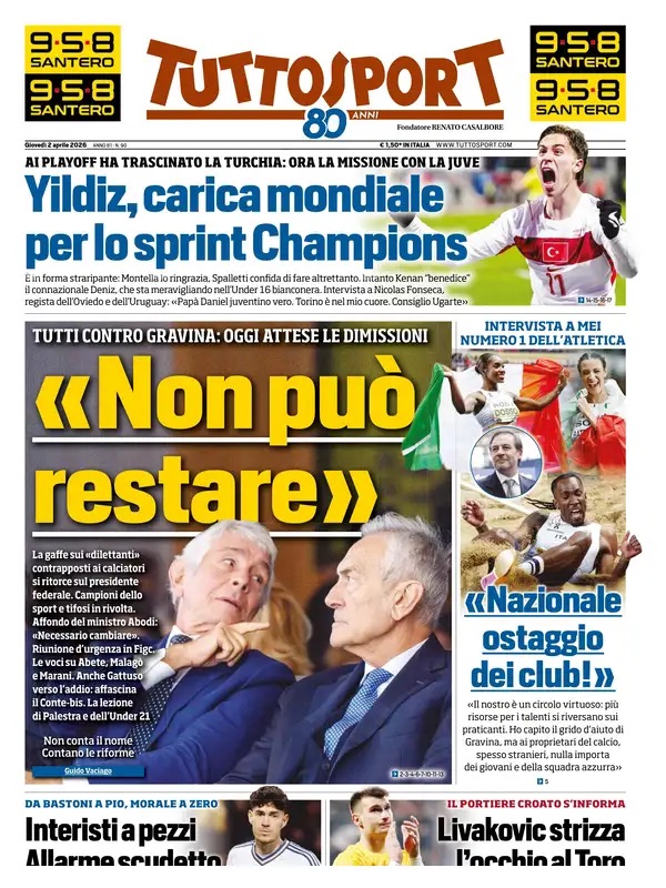 Ecco le prime pagine de La Gazzetta dello Sport, Tuttosport e Corriere dello Sport, i tre maggiori quotidiani sportivi di oggi, giovedi 2 aprile 2026.